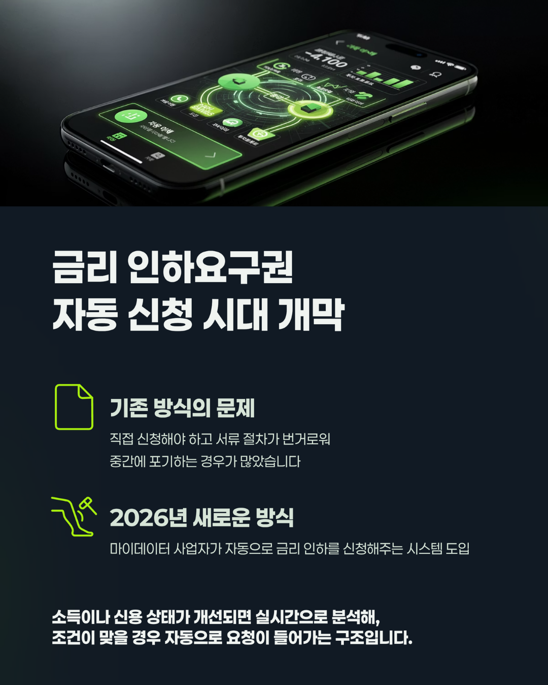 2026년부터는 마이데이터 사업자가 대신 자동으로 금리 인하를 신청해주는 방식이 도입됩니다.