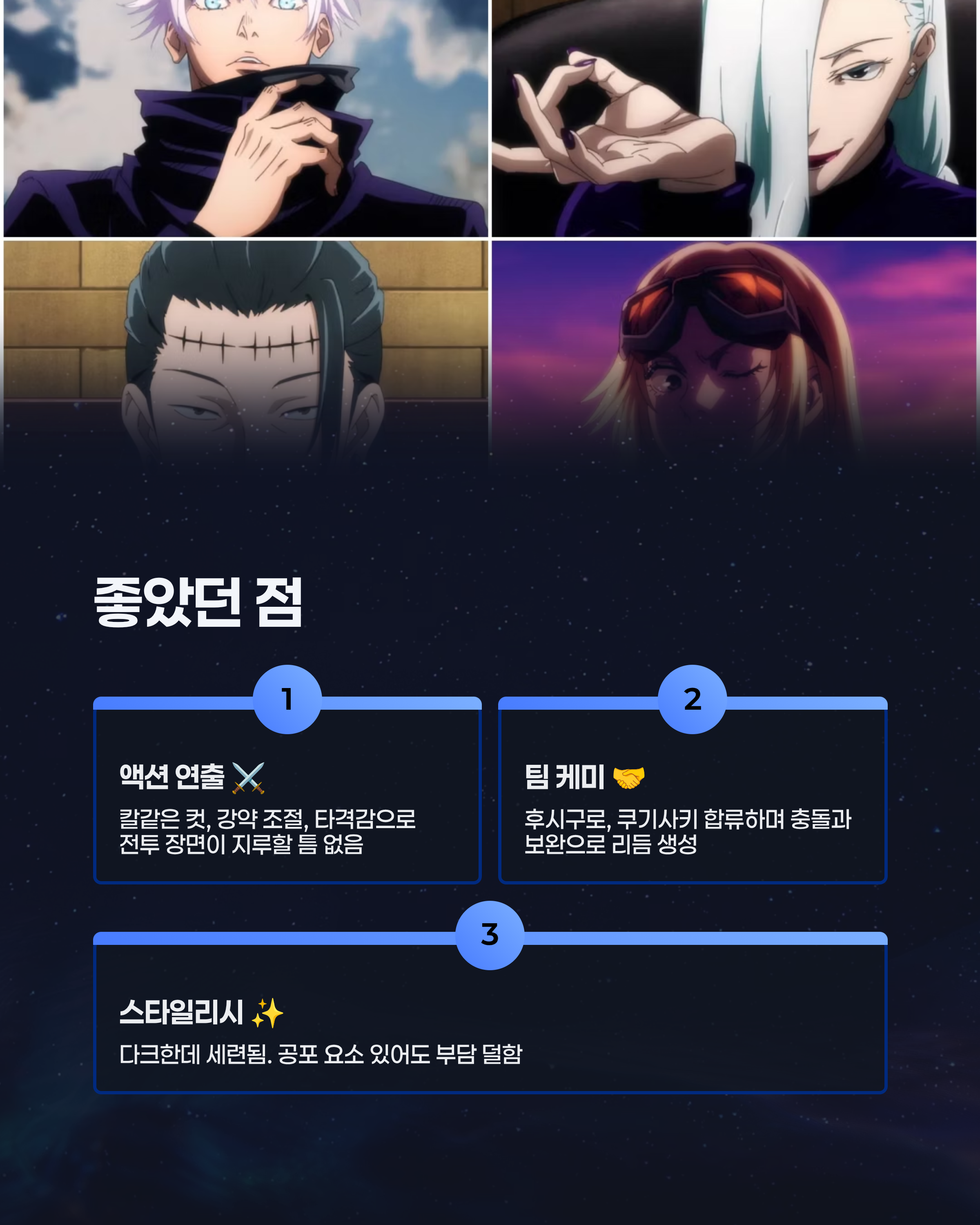 주술회전 시즌1은 액션이 더 좋았나요, 아니면 캐릭터 케미가 더 좋았나요? 댓글로 취향 알려주세요!