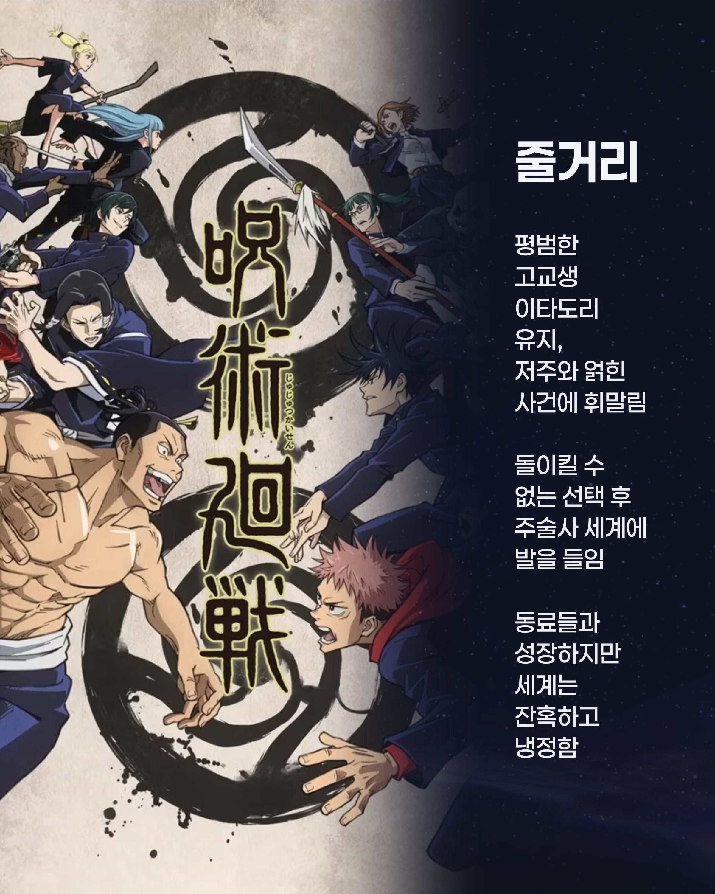 평범한(?) 고교생 이타도리 유지는 우연히 ‘저주’와 얽힌 사건에 휘말리며, 인간을 해치는 존재들과 맞서게 됩니다. 그러다 돌이킬 수 없는 선택을 하게 되고, 그 대가로 주술사들의 세계에 발을 들이죠. 학교라는 틀 안에서 동료들과 팀을 이루어 성장하지만, 이 세계는 생각보다 훨씬 잔혹하고 룰도 냉정합니다.