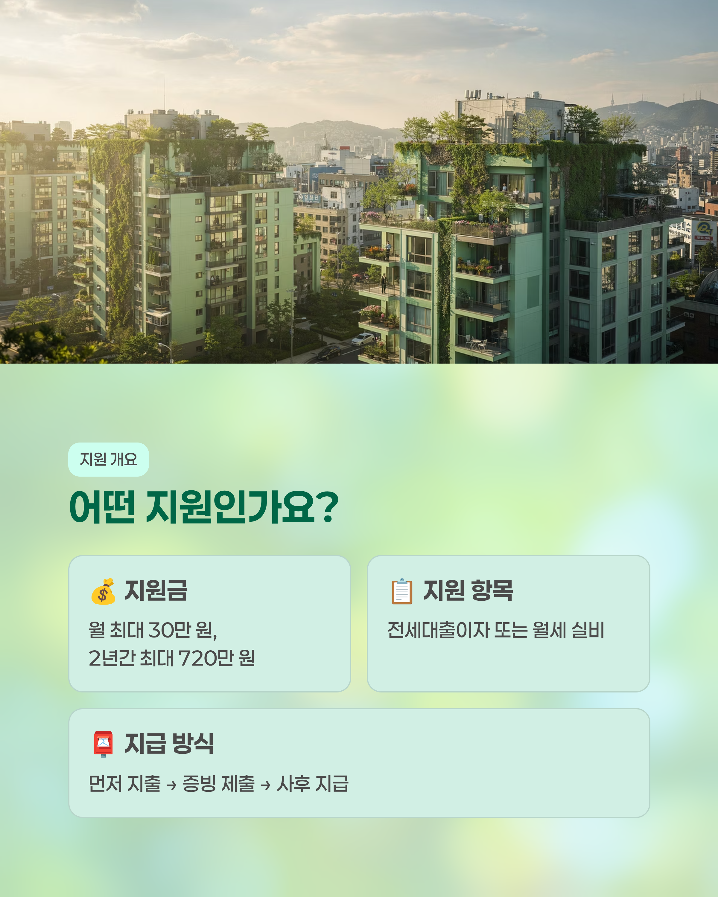 | 지원금 | 월 최대 30만 원 (2년, 최대 720만 원) |