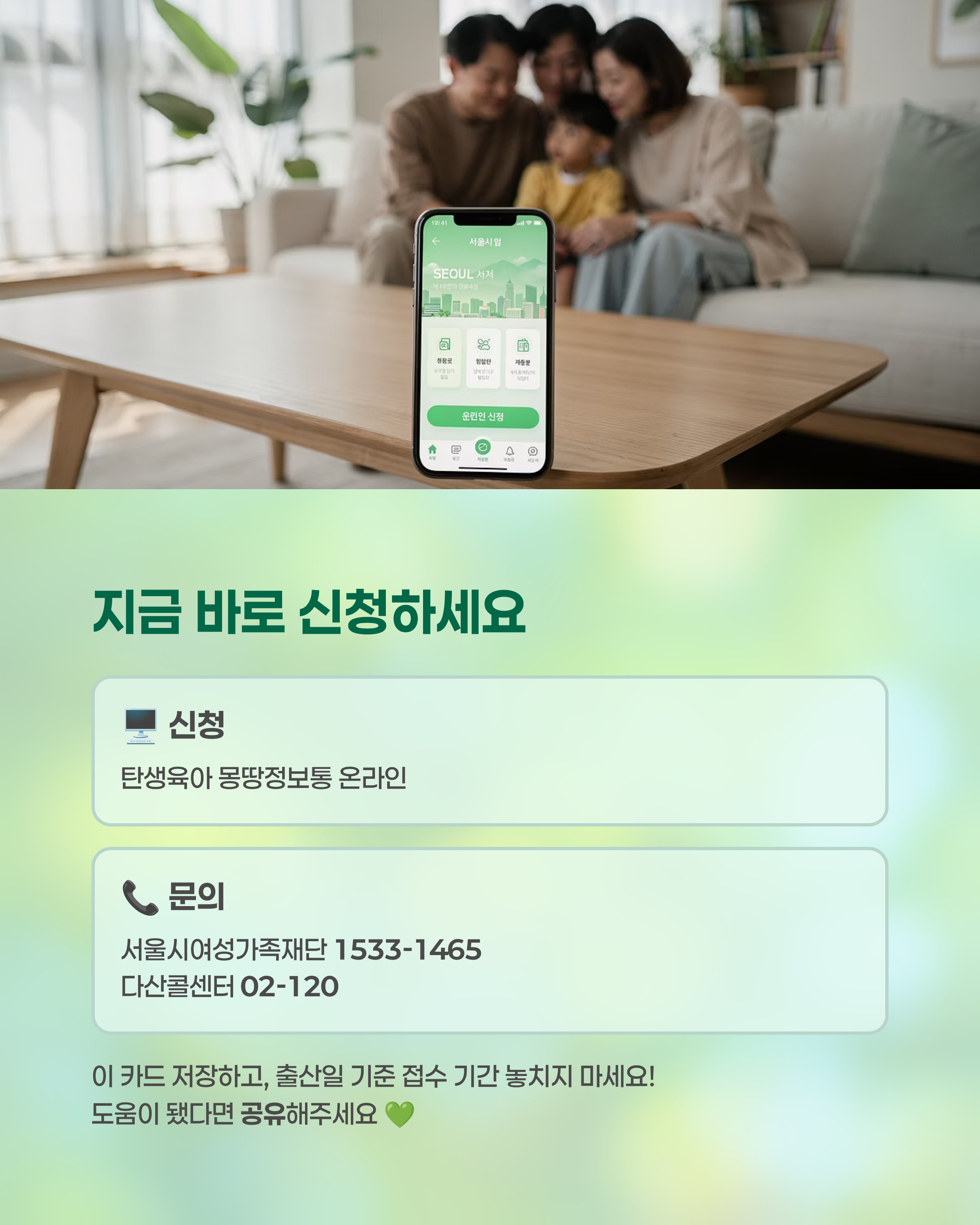 신청은 “탄생육아 몽땅정보통”에서 진행되고, 문의는 서울시여성가족재단 1533-1465 / 다산콜센터 02-120로 할 수 있어요.